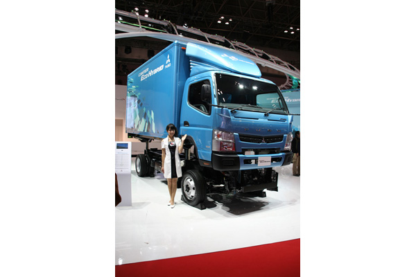 まずは小型トラックの「キャンター エコハイブリッド」。シャシーからキャブとバンが切り離されてたディスプレイです。こんな姿普段はなかなか見られないだけにインパクト抜群です! 車名のとおり、ハイブリッドシステムを搭載しています。ベースとなったキャンターは2010年に8年ぶりのフルモデルチェンジを実施し、エクステリアを一新。やや遅れてエコハイブリッドもフェイスチェンジし、これで2代目ということになります。