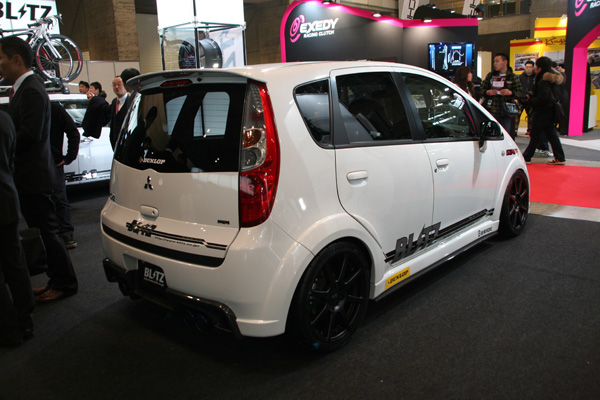 コンパクトスポーツ界のエボといえば、「コルトラリーアートバージョンR」。こちらもBLITZからの登場。ランエボ同様、新作エアロを装着しています。純正のオーバーフェンダーを付け替えるタイプで、バンパーには取り付け穴が用意されている親切設計です。